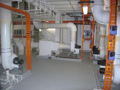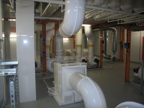 These scrubbing systems are designed to fit directly above the discharge of the fumecupboard. chemicals and acids are removed from the air before entering the duct system with the use of water and sprays and filtering pads. This "scrubbing system" keeps the duct clean from build up of chemicals and insures clean discharge to the atmosphere.